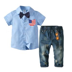 Baby Boys Blue Shirt With American Flag Pocket Ripped Jeans 3Set Suits. The new coming baby boys outfits give your child a gentle and handsome boy appearance. It fits for many special occasions and daily wear this season.