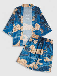 - Product Name: Dragon Print Kimono And Drawstring Beach Shorts Set